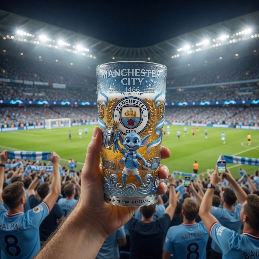 Dieser elegante blaue Becher zeigt stolz das ikonische Wappen von Manchester City, ein freudiges blaues Maskottchen, das triumphierend die Premier League-Trophäe hält, und den kühnen Schriftzug „ MANCHESTER CITY 146th ANNIVERSARY “, der alle von wirbelnden Bändern eingerahmt ist. goldene Lorbeeren und das inspirierende Motto „ VOM MAINE ROAD ZUR EWIGEN HERRLICHKEIT“ an der Basis.