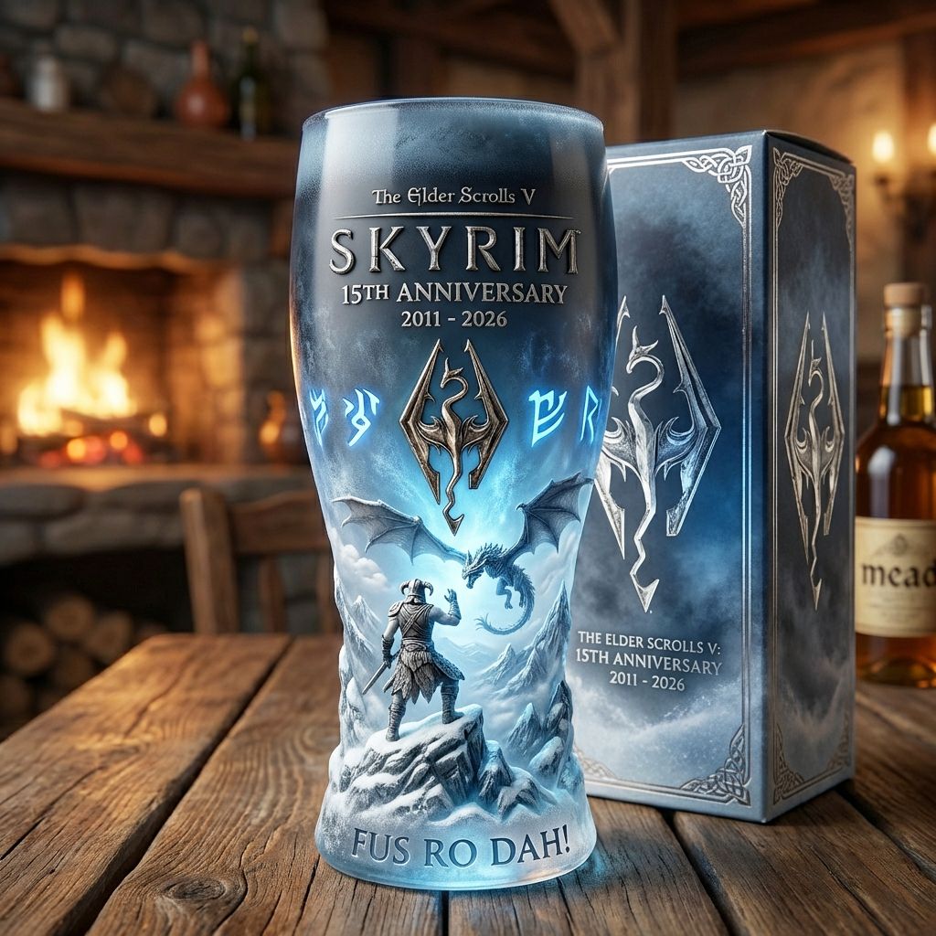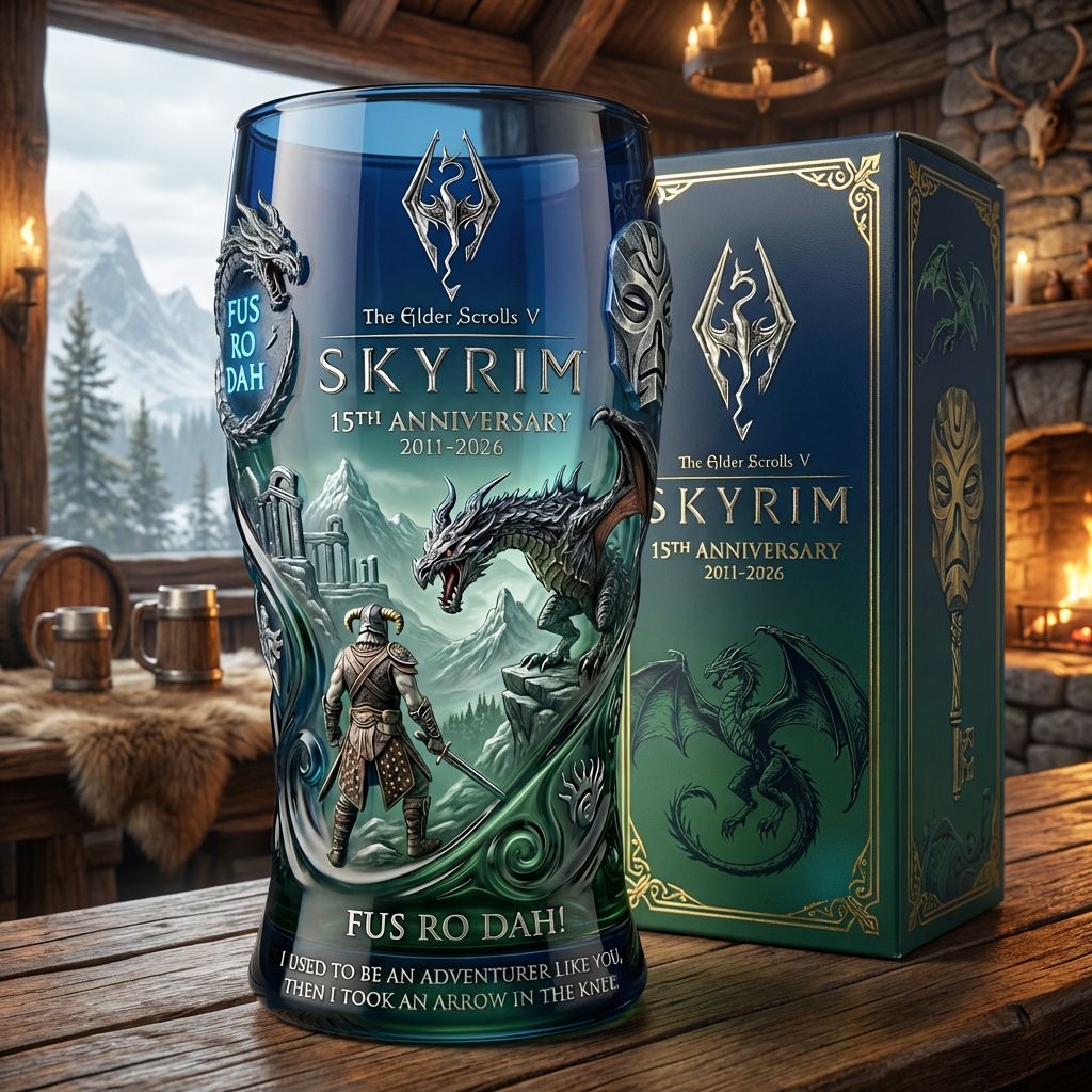 Heben Sie ein Glas auf die unvergessliche Reise von Abenteuer, Drachen und Schicksal. Das TES V 15th Anniversary Glass ist hier, um an 15 legendäre Jahre epischer Schlachten und unvergesslicher Quests zu erinnern!🏰🐉